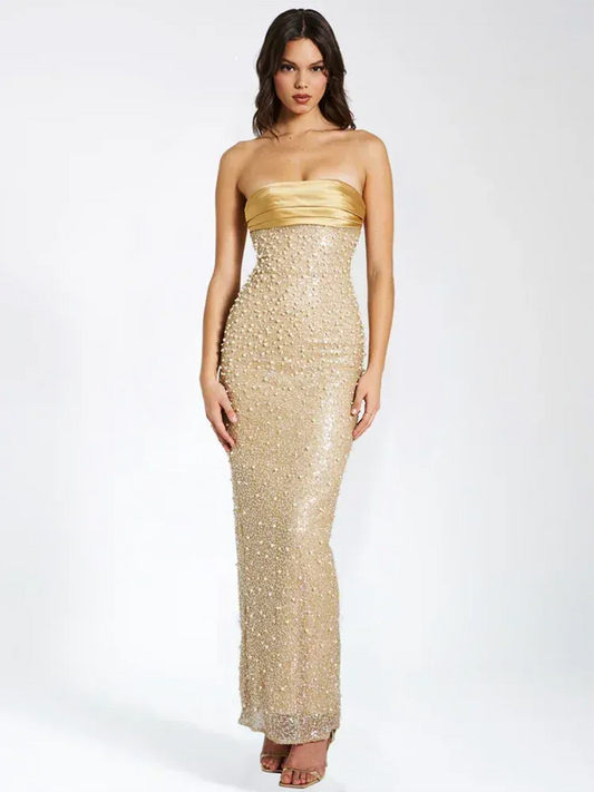 Vestido Elegante Longo Luxe Pérola – Sofisticação com Detalhes Dourados