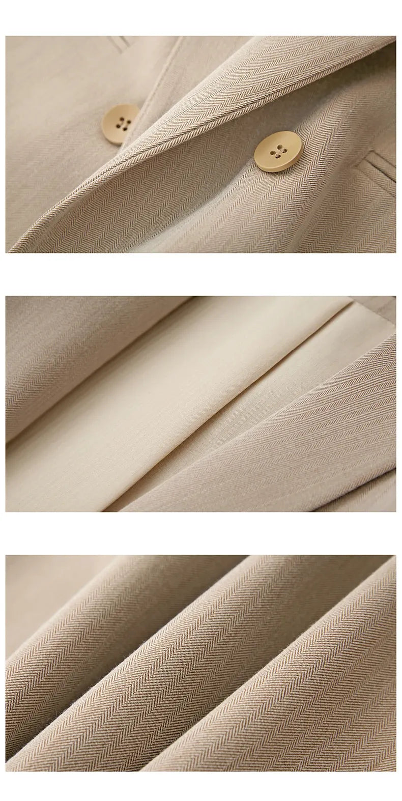 A modelagem solta com corte reto cria linhas limpas e elegantes, valorizando a silhueta sem marcar o corpo. O fechamento duplo e a gola entalhada reforçam a estética clássica da alfaiataria feminina contemporânea.
