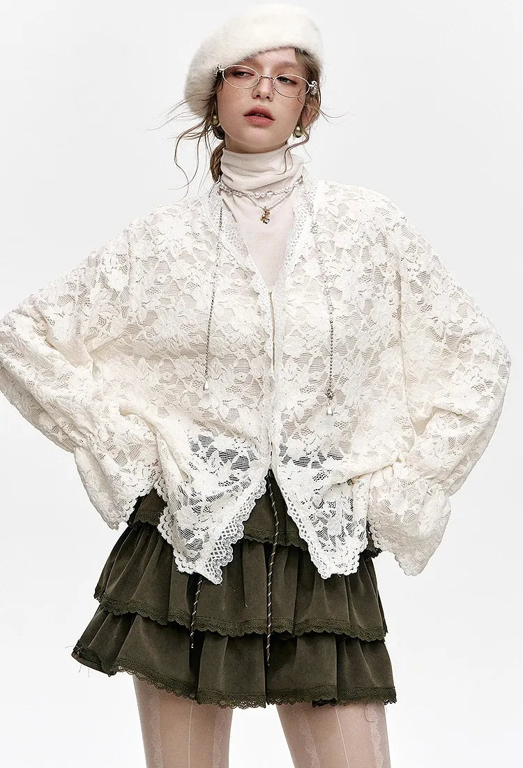 Confeccionada em renda leve com chiffon semi translúcido, a blusa oferece toque macio, caimento fluido e visual refinado, ideal para composições elegantes tanto no dia a dia quanto em ocasiões especiais.