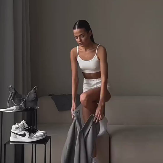- Modelagem: colete estruturado e shorts de alfaiataria com braguilha frontal.
