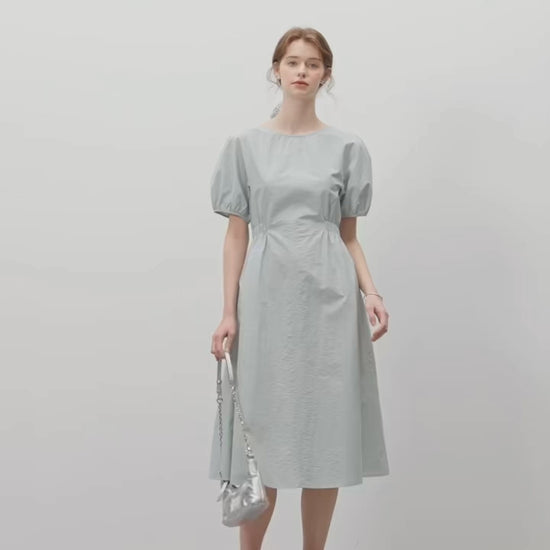 O corte A-line desenha a silhueta com fluidez, enquanto a cintura elástica se ajusta ao corpo sem apertar e sem marcar. As mangas bufantes trazem um toque romântico e atual, e o tecido de algodão premium com poliamida oferece frescor, respirabilidade e caimento suave – ideal para o verão e a meia-estação.